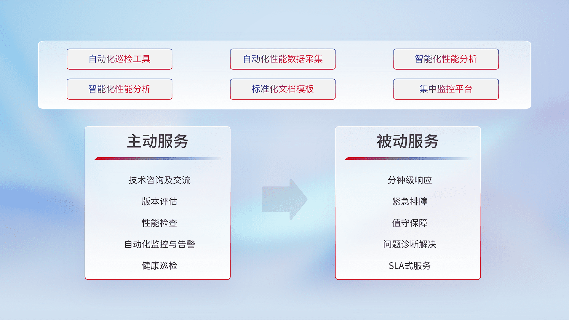 智能化工具和标准化文档,,,保障服务质量,,提供主动服务(包含技术咨询、、、、版本评估、、、性能检查、、、自动化监控与告警、、健康巡检)和被动服务包含(分钟级响应、、、紧急排障、、、、值守保障、、问题诊断解决、、SLA服务)。。